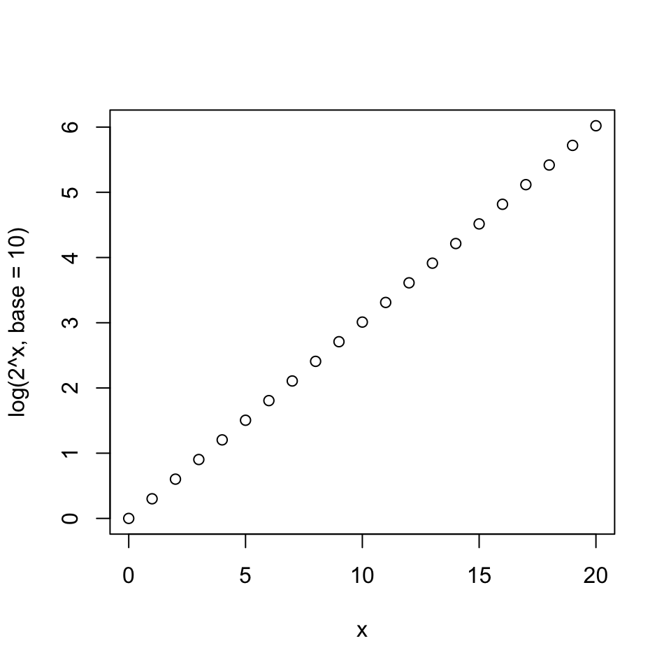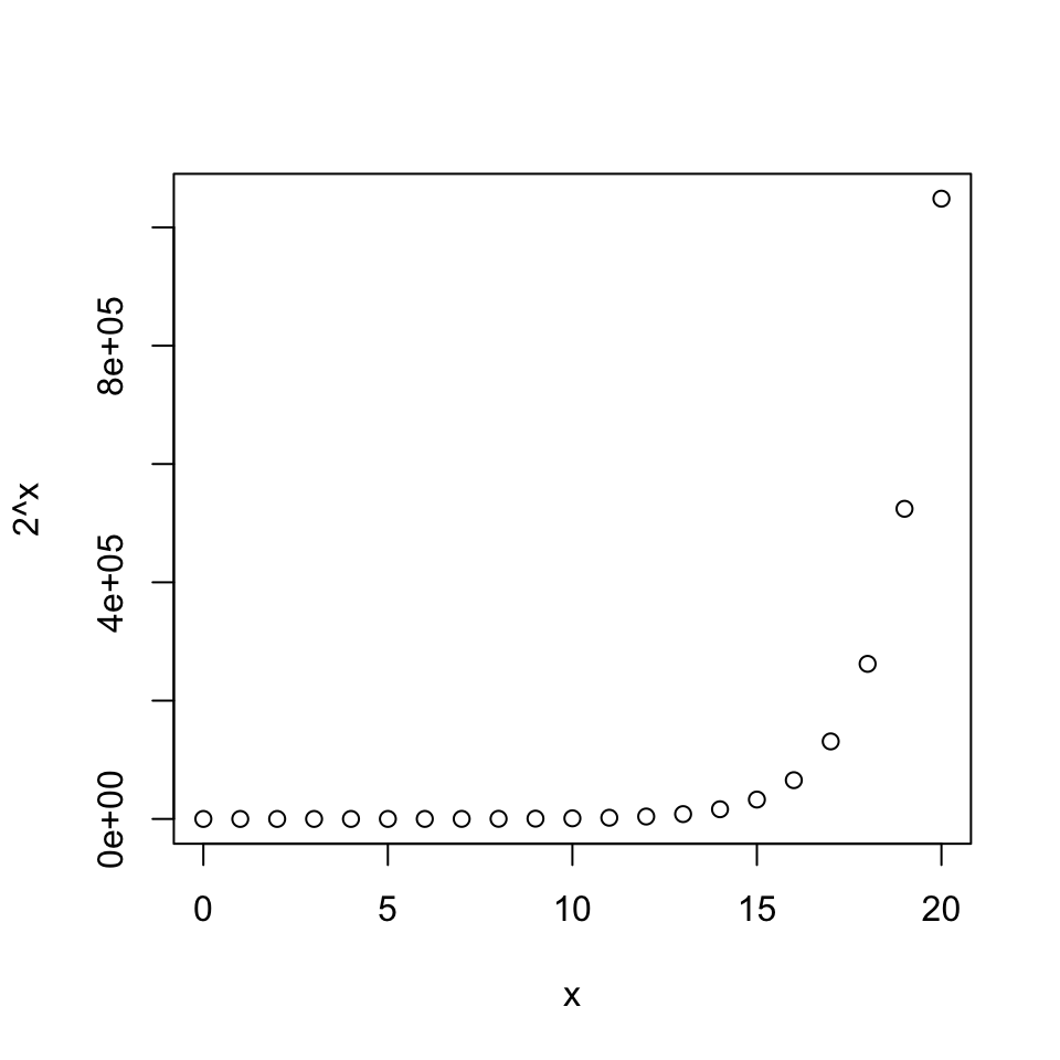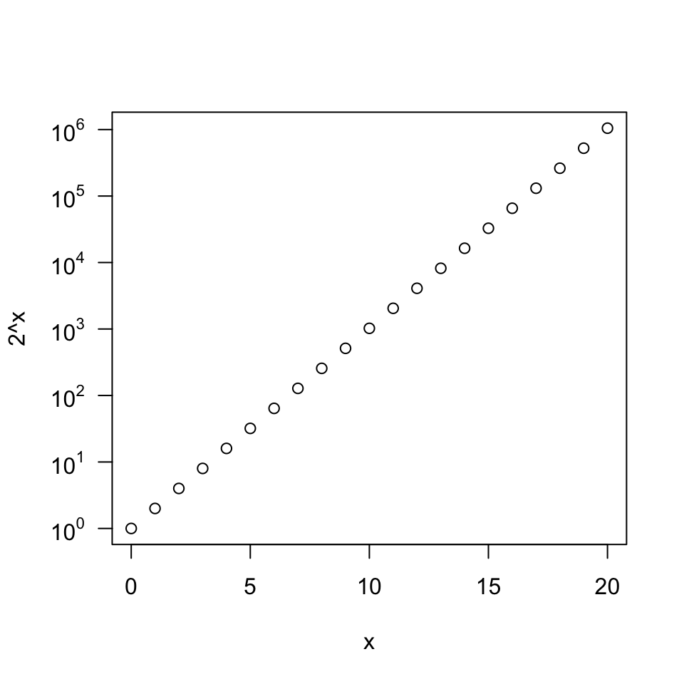 x <-0:20plot(x, 2^x, axes =FALSE, log ='y')axis(1)for(i in0:6)axis(2, at =10^i, labels =substitute(10^k, list(k = i)), las =1)box()