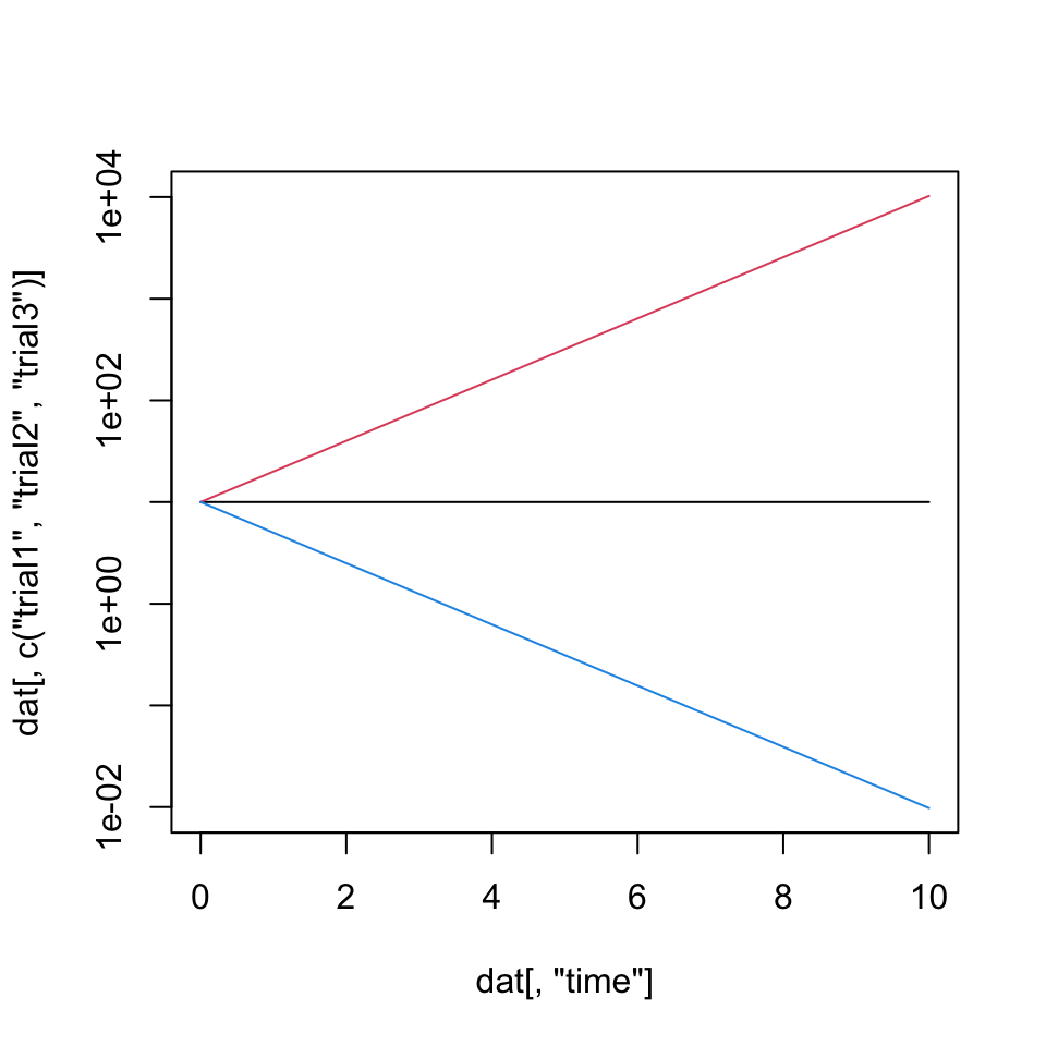 matplot(dat[, "time"], dat[, c("trial1", "trial2", "trial3")], type ='l', col =c(1, 2, 4), lty =1, log ='y')
