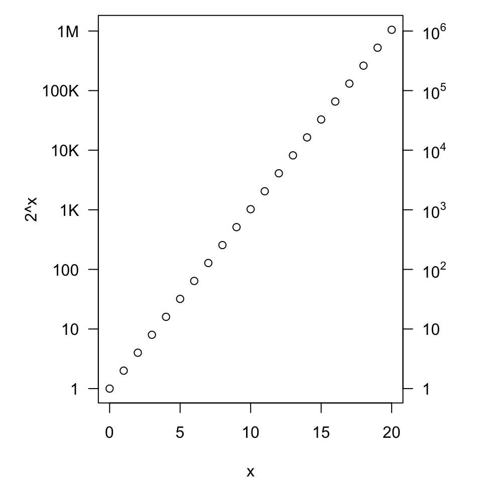 par(mar =c(4.1, 5.1, 0.8, 4.1))x <-0:20plot(x, 2^x, axes =FALSE, log ='y')axis(1)labs <-c("1", "10", "100", "1K", "10K", "100K", "1M")axis(2, at =10^(0:6), labels = labs, las =1)labs2 <-c("1", "10", expression(10^2), expression(10^3), expression(10^4), expression(10^5), expression(10^6))axis(4, at =10^(0:6), labels = labs2, las =1)box()