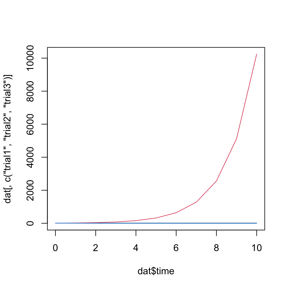 ymax <-max(dat[ , 2:4])plot(trial1 ~ time, dat, type ='l', ylim =c(0, ymax))lines(trial2 ~ time, dat, type ='l', col =2)lines(trial3 ~ time, dat, type ='l', col =4)