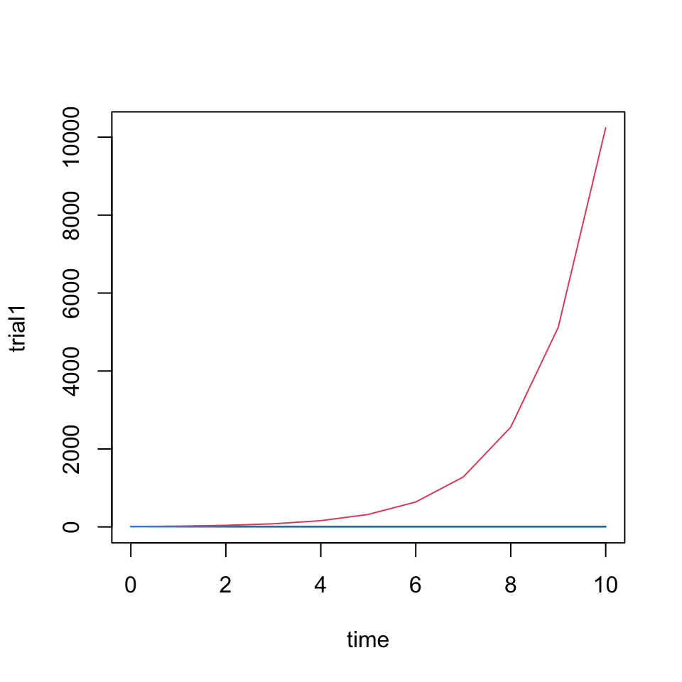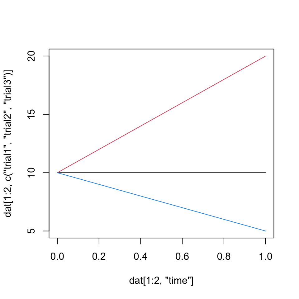 plot(trial1 ~ time, dat, type ='l', ylim =c(0, ymax))for(i in3:4)lines(dat[ , c(1, i)], lty =1, col = i)