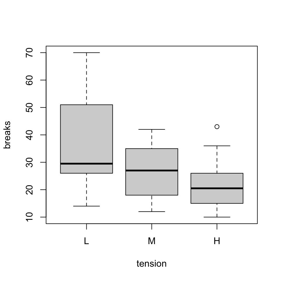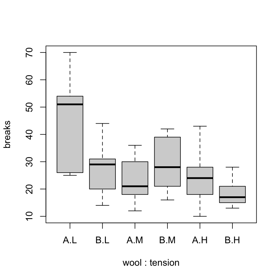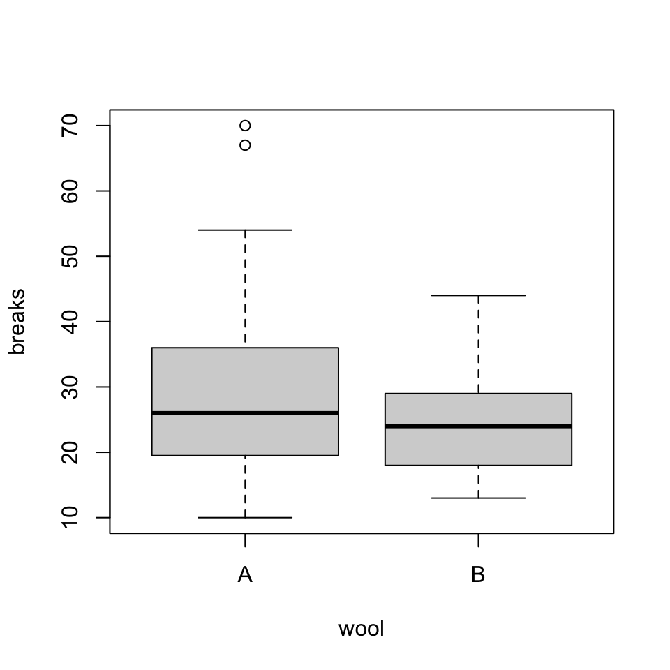 To look at other data, we will use the preloaded warpbreaks dataset which describes the occurrences of breakages of wool yarn under certain industrial settings. A boxplot showing breakages with respect to wool “type” is shown in Figure 11.