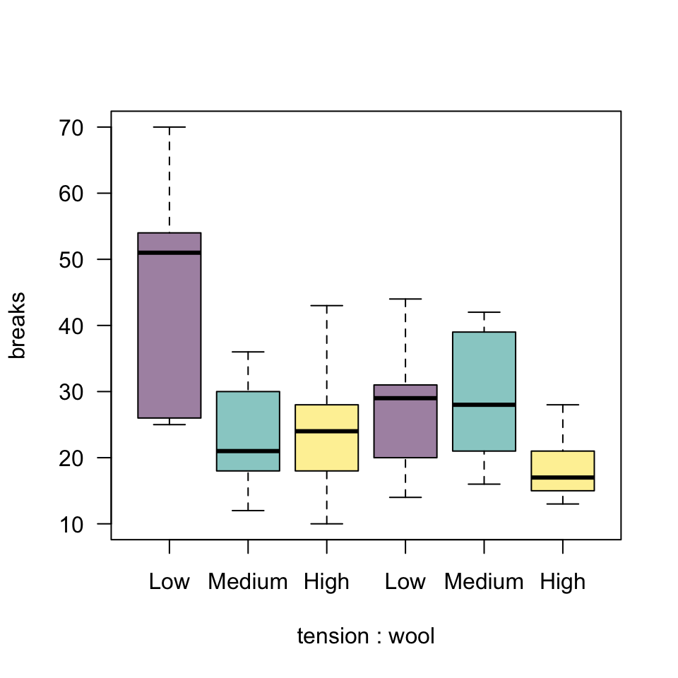 boxplot(breaks ~ tension*wool, warpbreaks, col =hcl.colors(3, alpha =0.5), axes =FALSE)axis(2, las =1)axis(1, at =1:6, labels =c("Low", "Medium", "High", "Low", "Medium", "High"), gap.axis =0)box()
