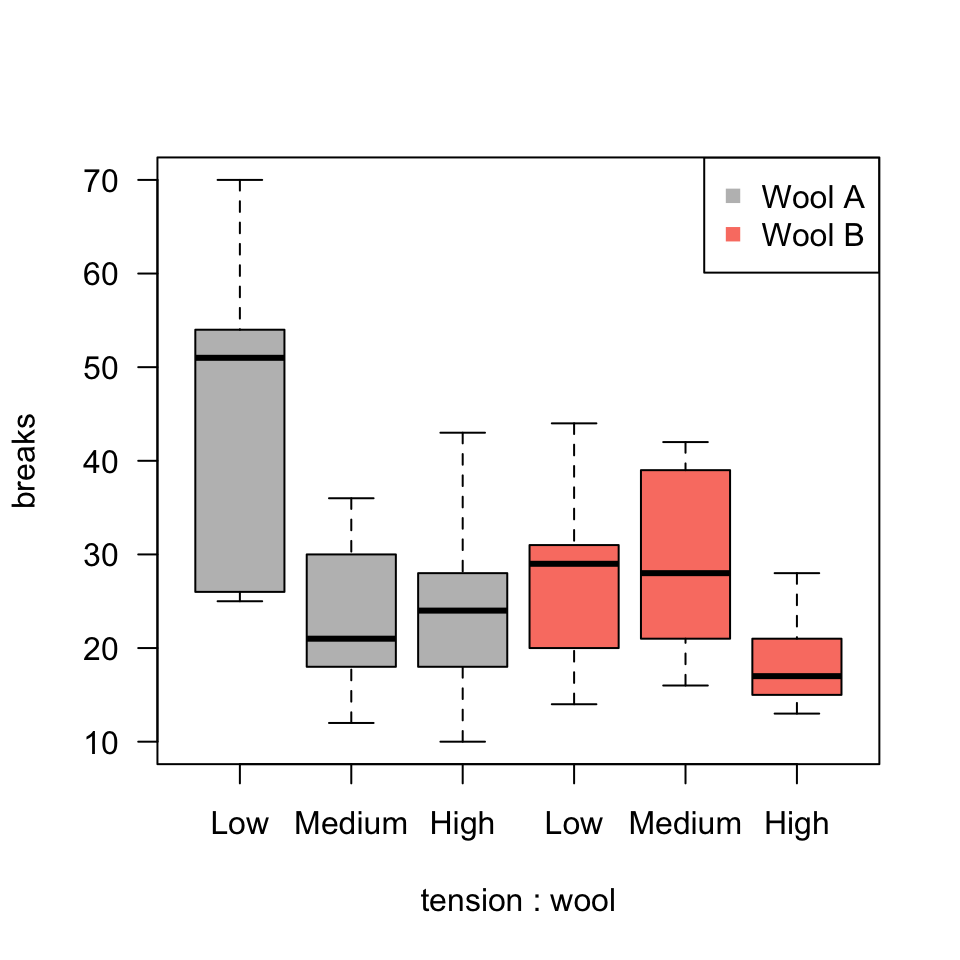 boxplot(breaks ~ tension*wool, warpbreaks, col =c(rep("gray", 3), rep("salmon", 3)), axes =FALSE)axis(2, las =1)axis(1, at =1:6, labels =c("Low", "Medium", "High", "Low", "Medium", "High"), gap.axis =0)legend("topright", c("Wool A", "Wool B"), col =c("gray", "salmon"), pch =15)box()