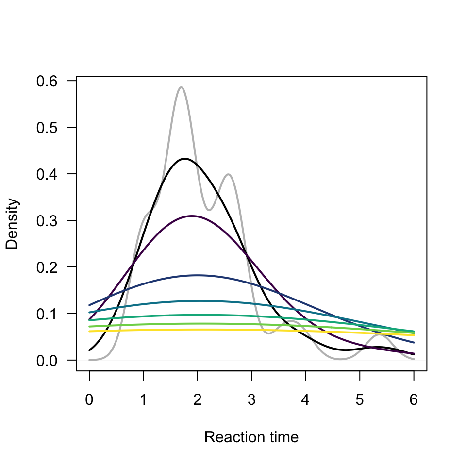 plot(density(dat[dat$Card =="D", "Time"], na.rm =TRUE, from =0, to =6, bw =0.25), col ="gray", lwd =2, main ="", xlab ="Reaction time", las =1)lines(density(dat[dat$Card =="D", "Time"], na.rm =TRUE, from =0, to =6, bw =0.5), col ="black", lwd =2)for(i in1:6)lines(density(dat[dat$Card =="D", "Time"], na.rm =TRUE, from =0, to =6, bw = i), col =hcl.colors(6)[i], lwd =2)