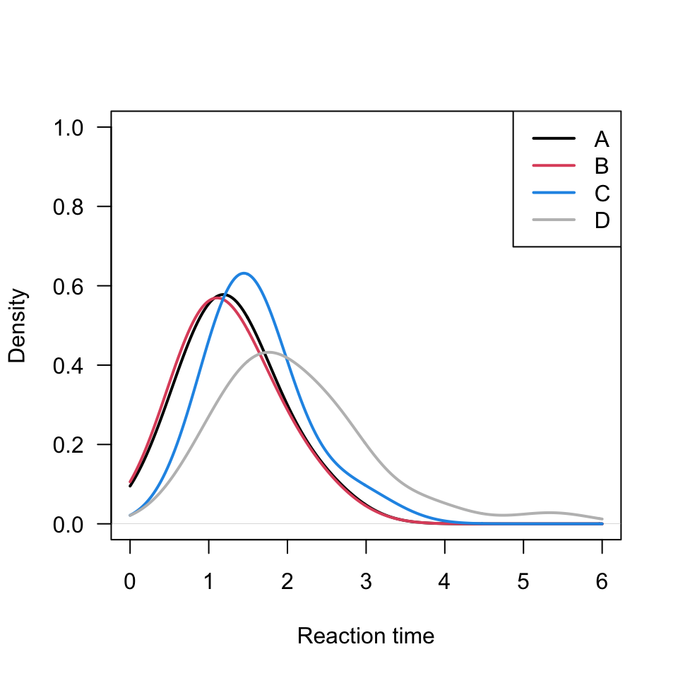 plot(density(dat[dat$Card =="A", "Time"], na.rm =TRUE, from =0, to =6, bw =0.5), ylim =c(0, 1), main ="", las =1, lwd =2, xlab ="Reaction time")lines(density(dat[dat$Card =="B", "Time"], na.rm =TRUE, from =0, to =6, bw =0.5), col =2, lwd =2)lines(density(dat[dat$Card =="C", "Time"], na.rm =TRUE, from =0, to =6, bw =0.5), col =4, lwd =2)lines(density(dat[dat$Card =="D", "Time"], na.rm =TRUE, from =0, to =6, bw =0.5), col ="gray", lwd =2)legend("topright", c("A", "B", "C", "D"), col =c(1, 2, 4, "gray"), lwd =2)