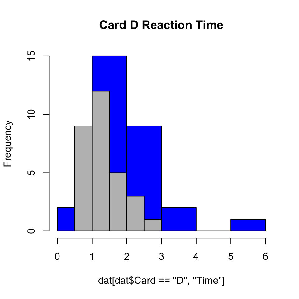 hist(dat[dat$Card =="D", "Time"], col ="blue", main ="Card D Reaction Time")hist(dat[dat$Card =="A", "Time"], col ="gray", add = T)