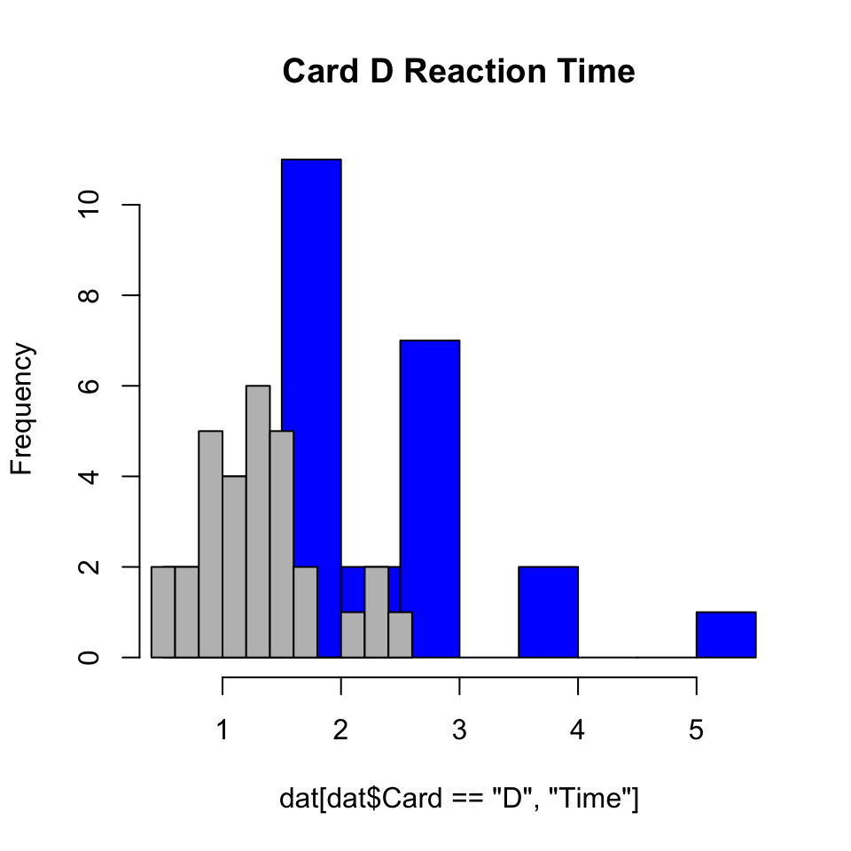 hist(dat[dat$Card =="D", "Time"], col ="blue", main ="Card D Reaction Time", breaks =10)hist(dat[dat$Card =="A", "Time"], col ="gray", add = T, breaks =10)