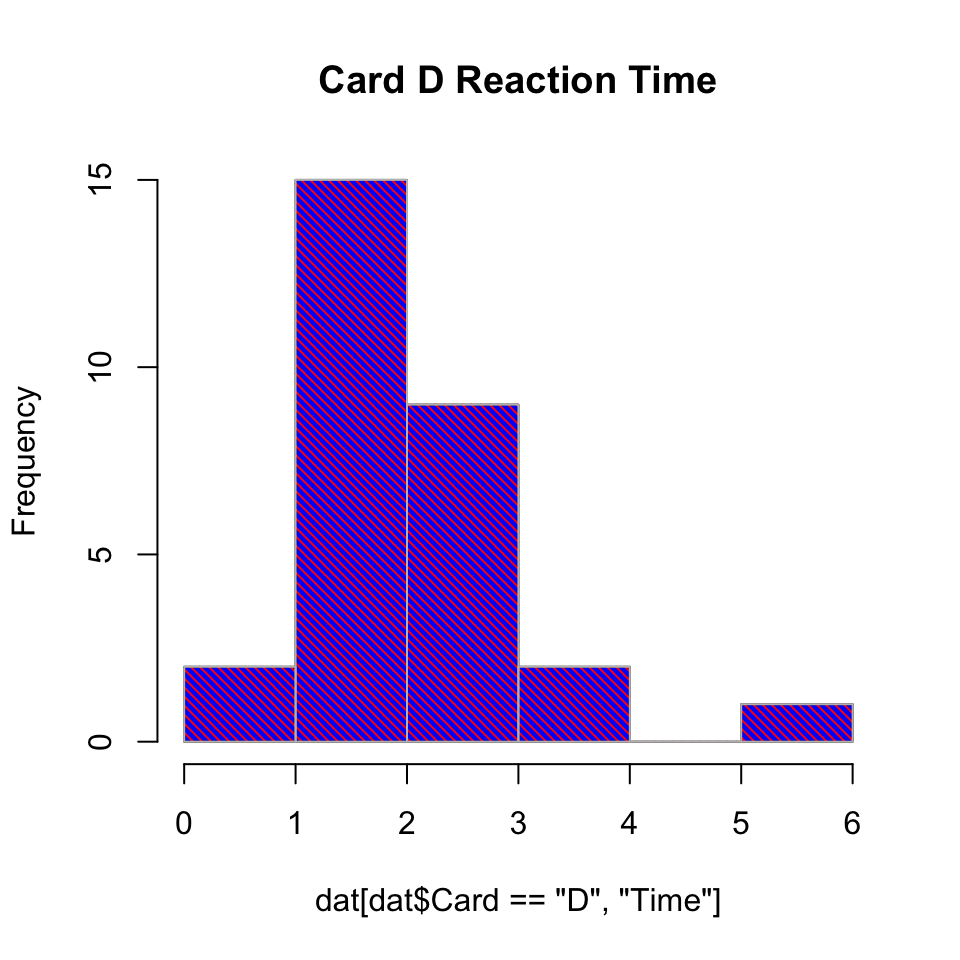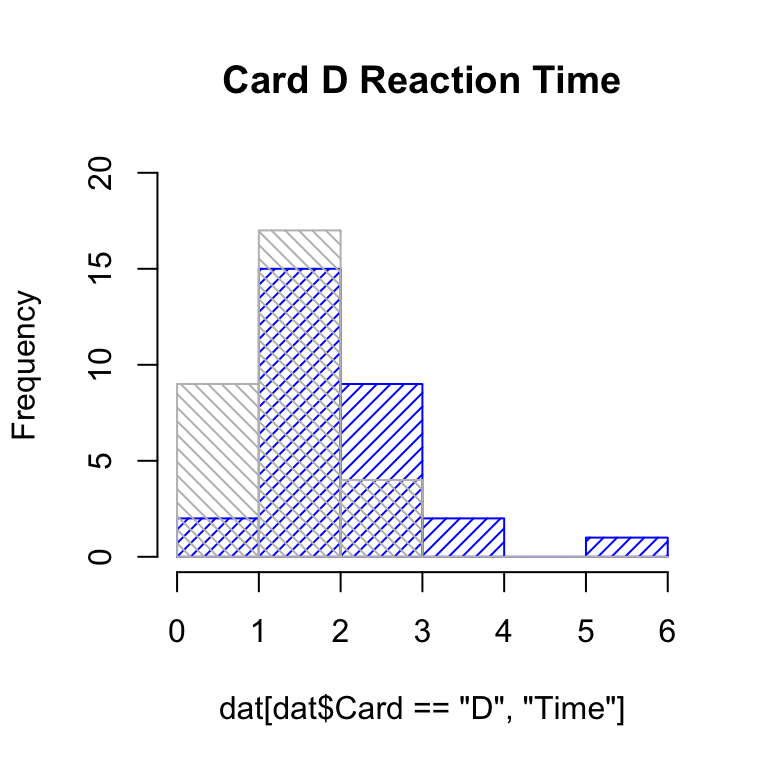 hist(dat[dat$Card =="D", "Time"], ylim =c(0, 20), col ="blue", density =20, angle =45, main ="Card D Reaction Time", breaks =0:6)hist(dat[dat$Card =="A", "Time"], col ="gray", density =20, angle =-45, breaks =0:6, add = T)