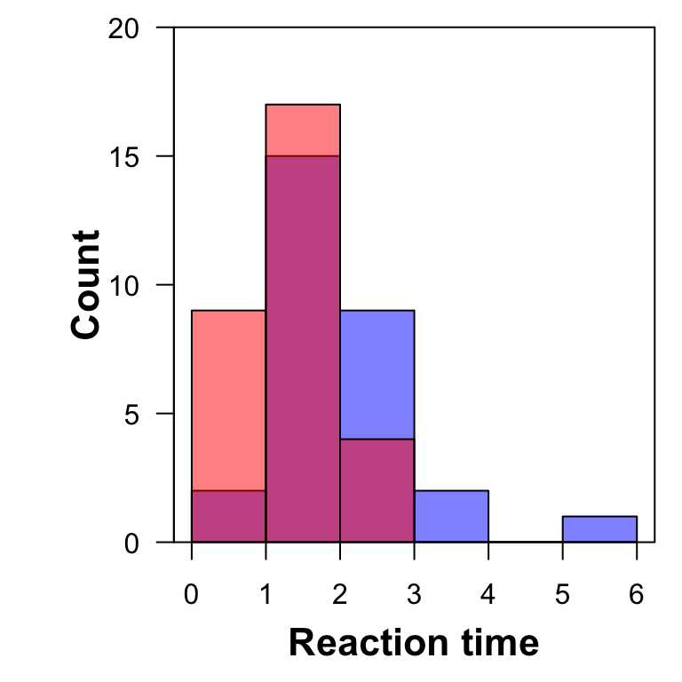 par(mar =c(4.1, 5.1, 0.8, 0.8), yaxs ="i")hist(dat[dat$Card =="D", "Time"], ylim =c(0, 20), col =rgb(0, 0, 1, alpha =0.5), main ="", breaks =0:6, xlab ="", ylab ="", las =1)mtext("Reaction time", 1, line =2.5, font =2, cex =1.35)mtext("Count", 2, line =2, font =2, cex =1.35)hist(dat[dat$Card =="A", "Time"], col =rgb(1, 0, 0, alpha =0.5),breaks =0:6, add = T)box(col ="black")## add legend## experiment with freq = FALSE (affects both graphs and ylim)