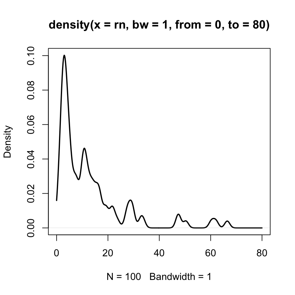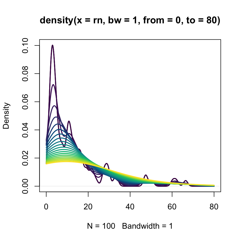 plot(density(rn, from =0, to =80, bw =1), lwd =2)for(i in1:20)lines(density(rn, from =0, to =80, bw = i), col =hcl.colors(20)[i], lwd =2)
