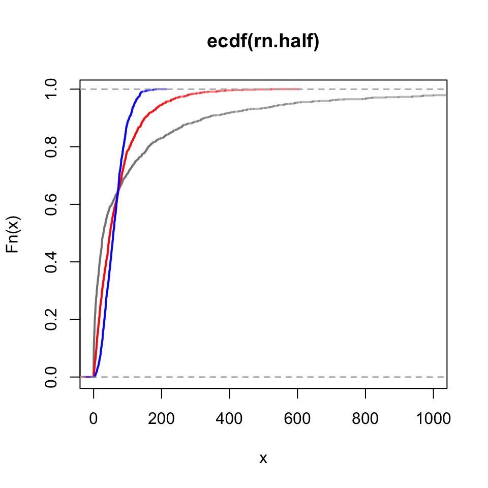 plot(ecdf(rn.half), pch =NA, col =gray(0.5, alpha =0.5), xlim =c(0, 1000), lwd =2)lines(ecdf(rn.one), col =rgb(1, 0, 0, alpha =0.5), lwd =2)lines(ecdf(rn.two), col =rgb(0, 0, 1, alpha =0.5), lwd =2)