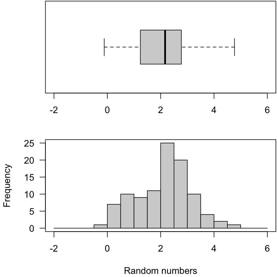 set.seed(020425)rn <-rnorm(n =100, mean =2, sd =1)## summary(rn)par(mfrow =c(2, 1), mar =c(4.1, 4.1, 0.1, 0.1))boxplot(rn, horizontal=T, xlab ="", ylim =c(-2, 6))hist(rn, breaks =seq(-2, 6, by =0.5), main ="", xlab ="Random numbers", las =1)box()
