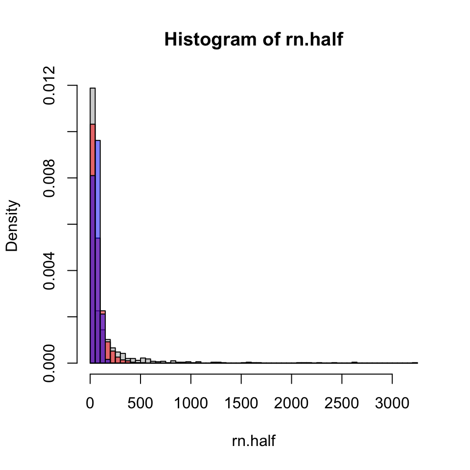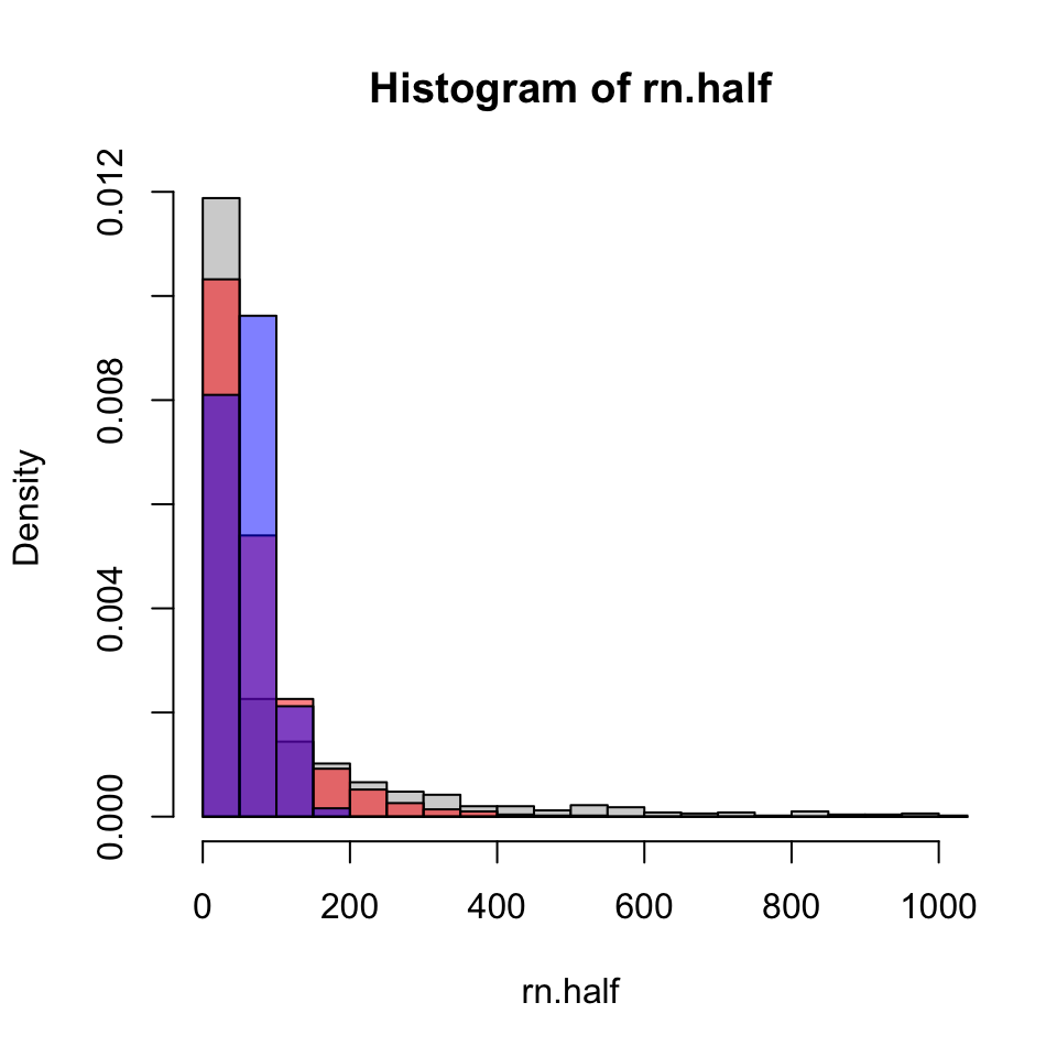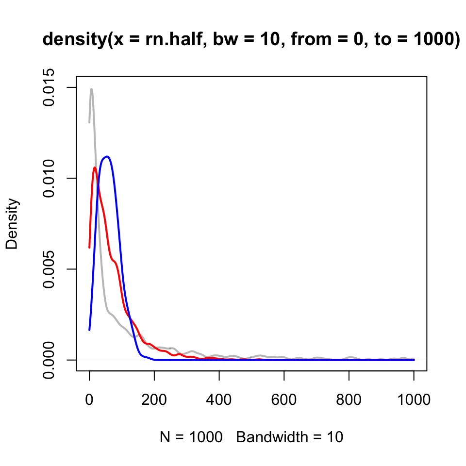 plot(density(rn.half, from =0, to =1000, bw =10), col =gray(0.5, alpha =0.5), lwd =2, ylim =c(0, 0.015))lines(density(rn.one, from =0, to =1000, bw =10), col =rgb(1, 0, 0, alpha =1), lwd =2)lines(density(rn.two, from =0, to =1000, bw =10), col =rgb(0, 0, 1, alpha =1), lwd =2)