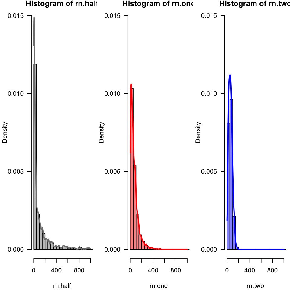 par(mfrow =c(1, 3), mar =c(4.1, 4.1, 0.8, 0.5))hist(rn.half, col =gray(0.5, alpha =0.5), freq =FALSE, breaks = (0:xmax)*50, ylim =c(0, 0.015), las =1, xlim =c(0, 1000))lines(density(rn.half, from =0, to =1000, bw =10), col =gray(0.5, alpha =1), lwd =2, ylim =c(0, 0.015))hist(rn.one, col =rgb(1, 0, 0, alpha =0.5), freq =FALSE, breaks = (0:xmax)*50, ylim =c(0, 0.015), las =1, xlim =c(0, 1000))lines(density(rn.one, from =0, to =1000, bw =10), col =rgb(1, 0, 0, alpha =1), lwd =2)hist(rn.two, col =rgb(0, 0, 1, alpha =0.5), freq =FALSE, breaks = (0:xmax)*50, ylim =c(0, 0.015), las =1, xlim =c(0, 1000))lines(density(rn.two, from =1, to =1000, bw =10), col =rgb(0, 0, 1, alpha =1), lwd =2)