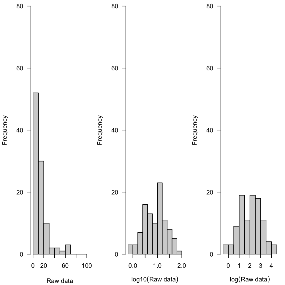rn <-rlnorm(n =100, mean =2, sd =1)## boxplot(rn)par(mfrow =c(1, 3), yaxs ="i", mar =c(4.1, 4.1, 0.8, 0.8))hist(rn, xlim =c(0, 100), ylim =c(0, 80), las =1, main ="", xlab ="Raw data")hist(log10(rn), ylim =c(0, 80), las =1, main ="", xlab =expression(log10("Raw data")))hist(log(rn), ylim =c(0, 80), las =1, main ="", xlab =expression(log("Raw data")))