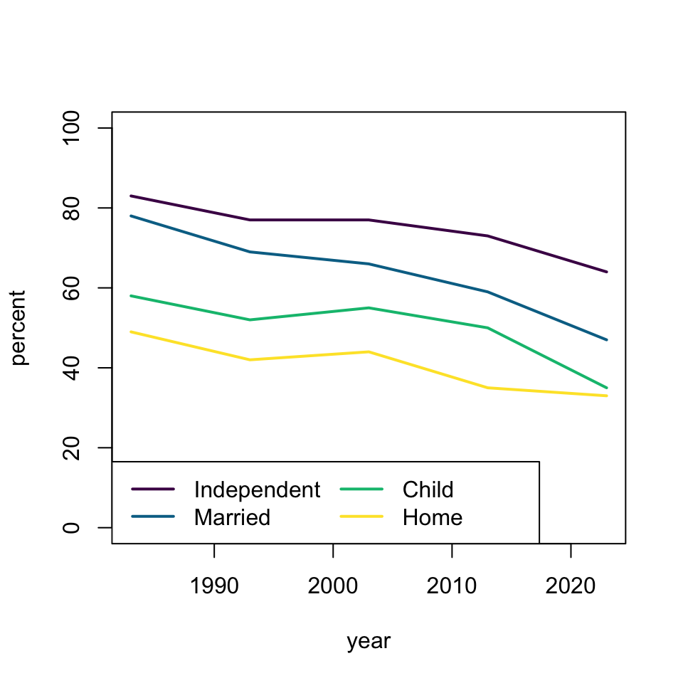 plot(percent ~ year, dat, subset = milestone =="independent", ylim =c(0, 100), type ='l', lwd =2, col =hcl.colors(4)[1])lines(percent ~ year, dat, subset = milestone =="married", type ='l', lwd =2, col =hcl.colors(4)[2])lines(percent ~ year, dat, subset = milestone =="child", type ='l', lwd =2, col =hcl.colors(4)[3])lines(percent ~ year, dat, subset = milestone =="home", type ='l', lwd =2, col =hcl.colors(4)[4])legend("bottomleft", c("Independent", "Married", "Child", "Home"), lty =1, lwd =2, col =hcl.colors(4))